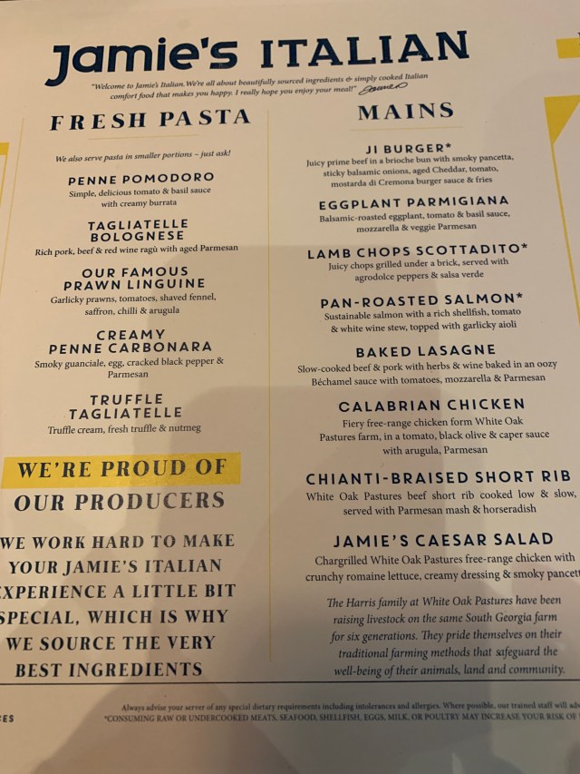 For my “+1” dinner on my Chops +1 reservation, I was kind of waivering between Jamie’s Italian and Hooked Seafood. Hooked is a fairly new concept so I have never been there before; and I do want to try it eventually, but since this cruise was supposed to be “All About Me!!” I decided to go to Jamie’s so that I could have my favorite pasta dish at sea.