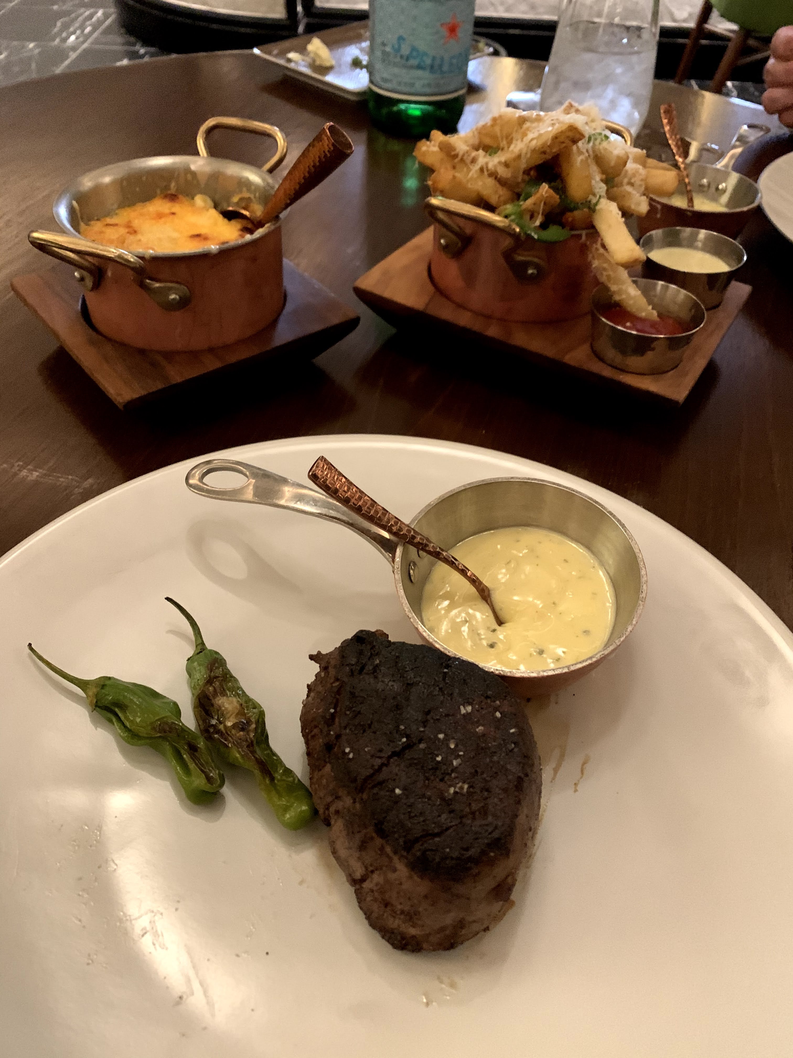 You can also see our sides in the background. Mac & Cheese ($17) and something called “Dirty Fries ($17).” I am still not entirely sure what mad them ‘dirty’ but they were yummy! So was Mac & Cheese. The filets were perfectly cooked and delicious.