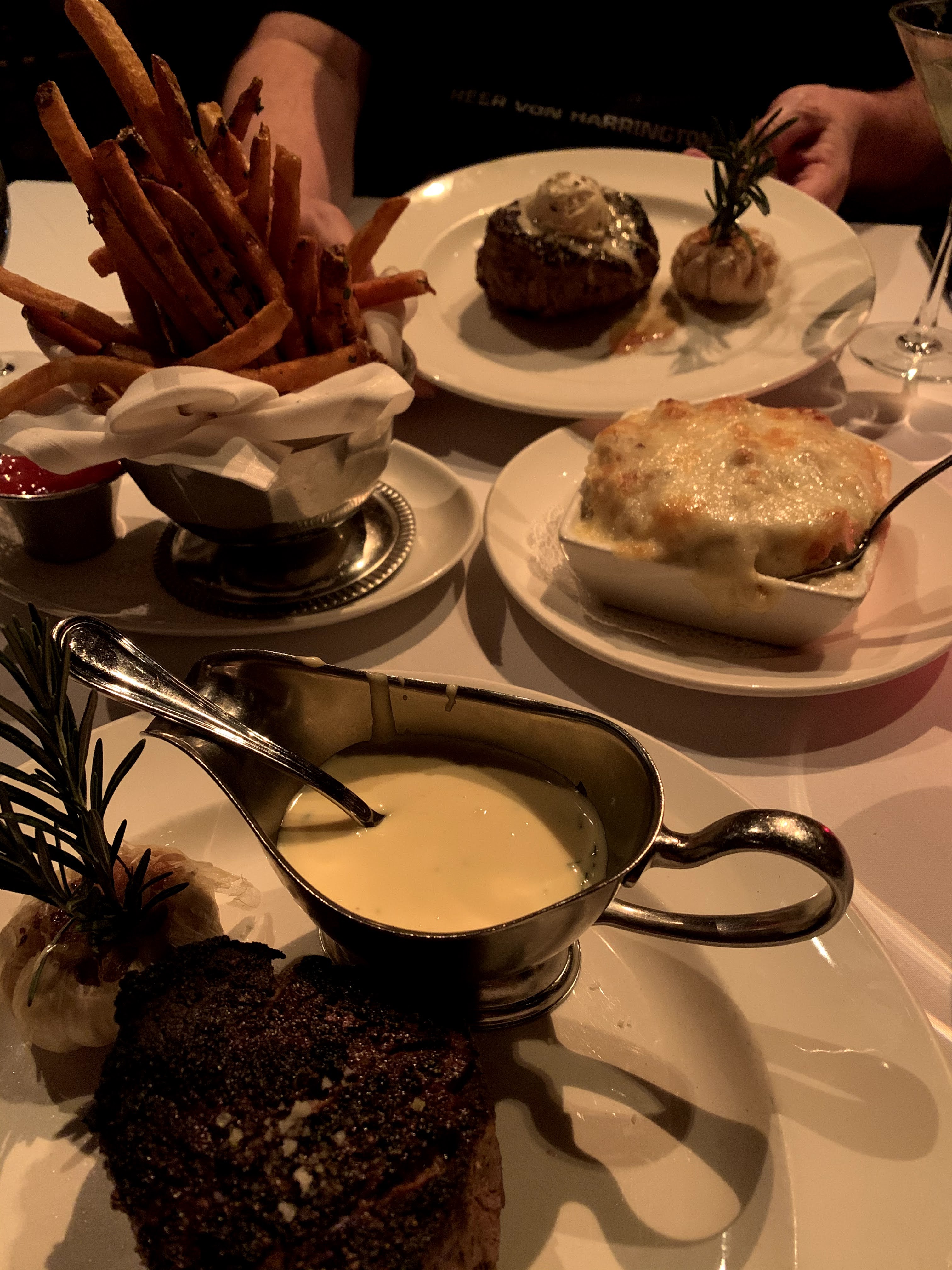 We were not hungry enough to warrant appetizers, not that that has stopped us before, but there was nothing really calling us on the appetizer menu so on we went to entrees. I ordered the filet with Béarnaise and the famous Strip House Potatoes as my side. Michael ordered the filet as well, but with truffle butter and herbed French fries as his side. The bread service was pretzel bread, which was AMAZING!! That’s also part of the reason we didn’t order any appetizers I think.