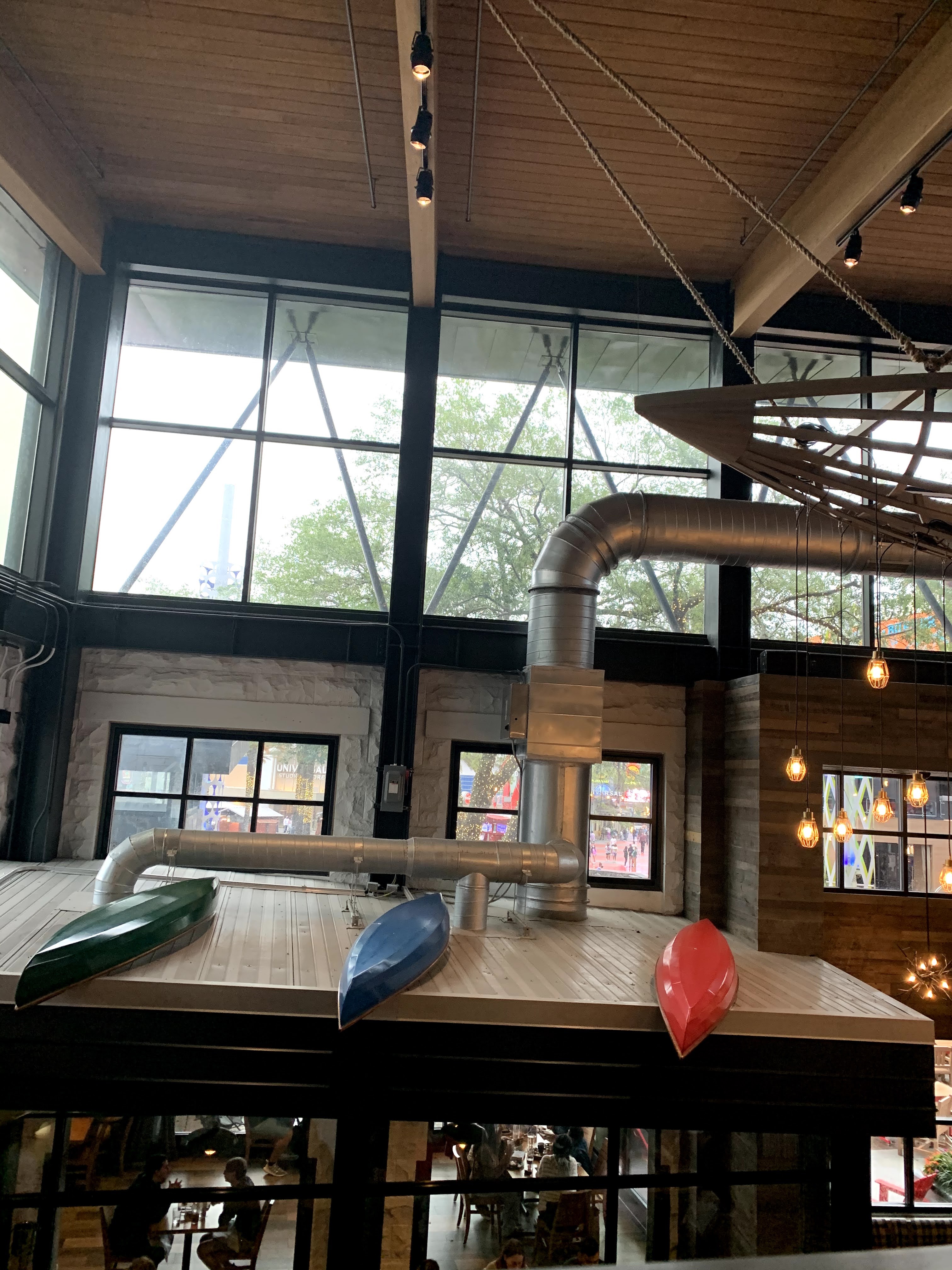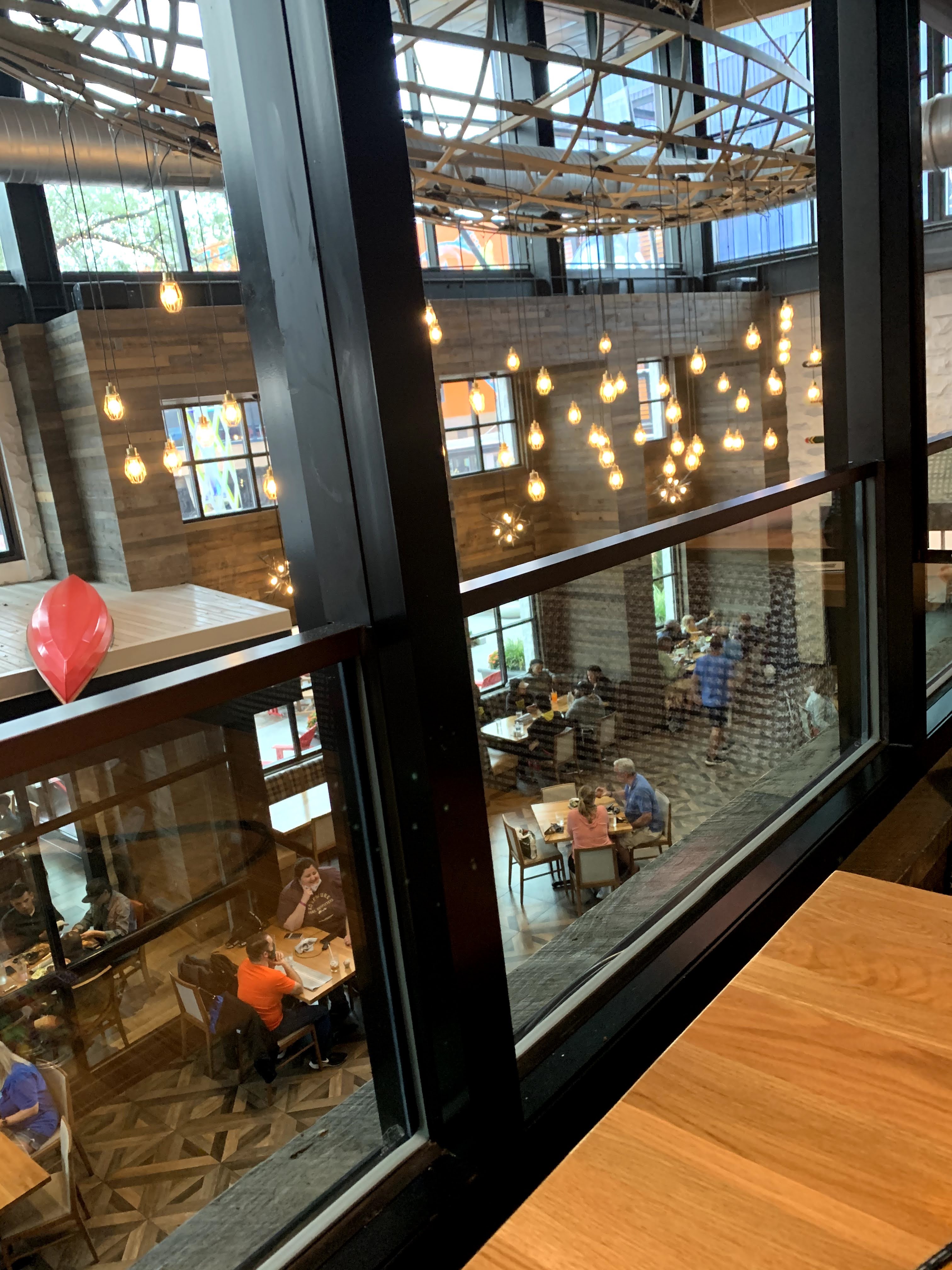 The décor is very rustic lake house and the restaurant is open and spacious.